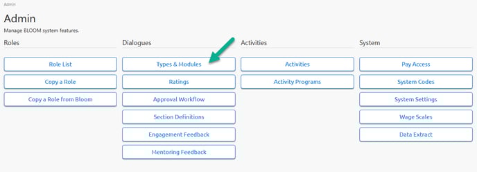 STEP 1: From the Admin panel select TYPES & MODULES from the Dialogue menu.