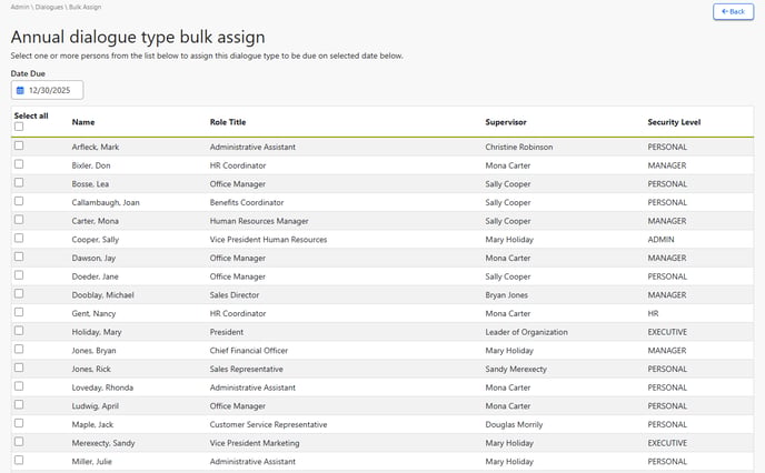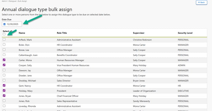 STEP 4: From the screen in Step 1 above, click BULK ASSIGN to select the team members whom you want to assign the dialogue to. Select all, or check the boxes for only those you wish to assign the dialogue type to. Also, select Date Due at the top, which will set a deadline for all team members to complete the dialogue.