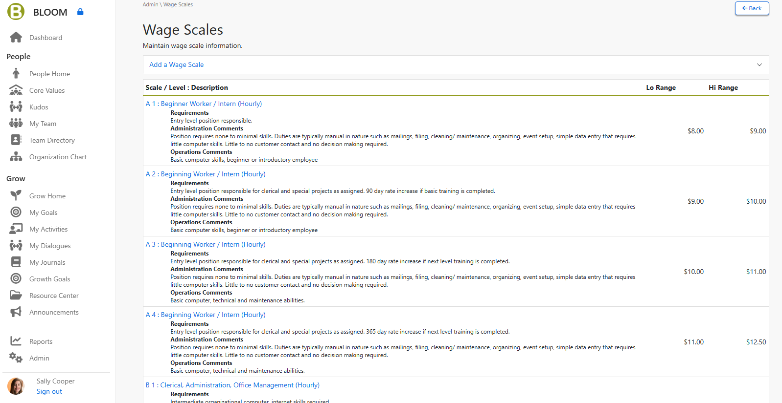 - Finalize your wage scales and enter them into BLOOM (ADMIN/WAGE SCALES). Be sure to create separate wage scales for exempt and non‐exempt roles. Then assign wage scales to role codes, approve the updated role codes, and then enter and assign Team Members to the role code. Then you are set!